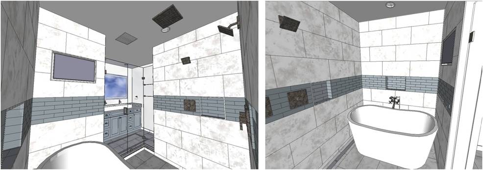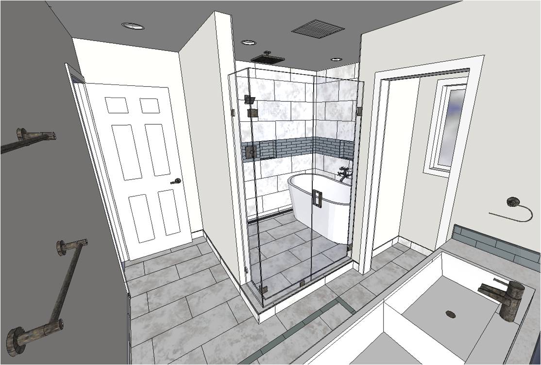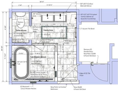 The intent on the Master Bathroom remodel was to include an organized clean modern farmhouse look including a new entry door to separate the Bathroom from the Master Bedroom. The design takes advantage of the geometry of the existing space to provide a unified tub-shower alcove with a freestanding soaking tub, a double shower with ceiling mounted rain-shower, and frameless glass enclosure. A linear custom vanity with double vessel sink and a contemporary LED back-lit mirror is also included. The existing toilet alcove was reused to create a framed enclosure and entry to the tub-shower alcove.