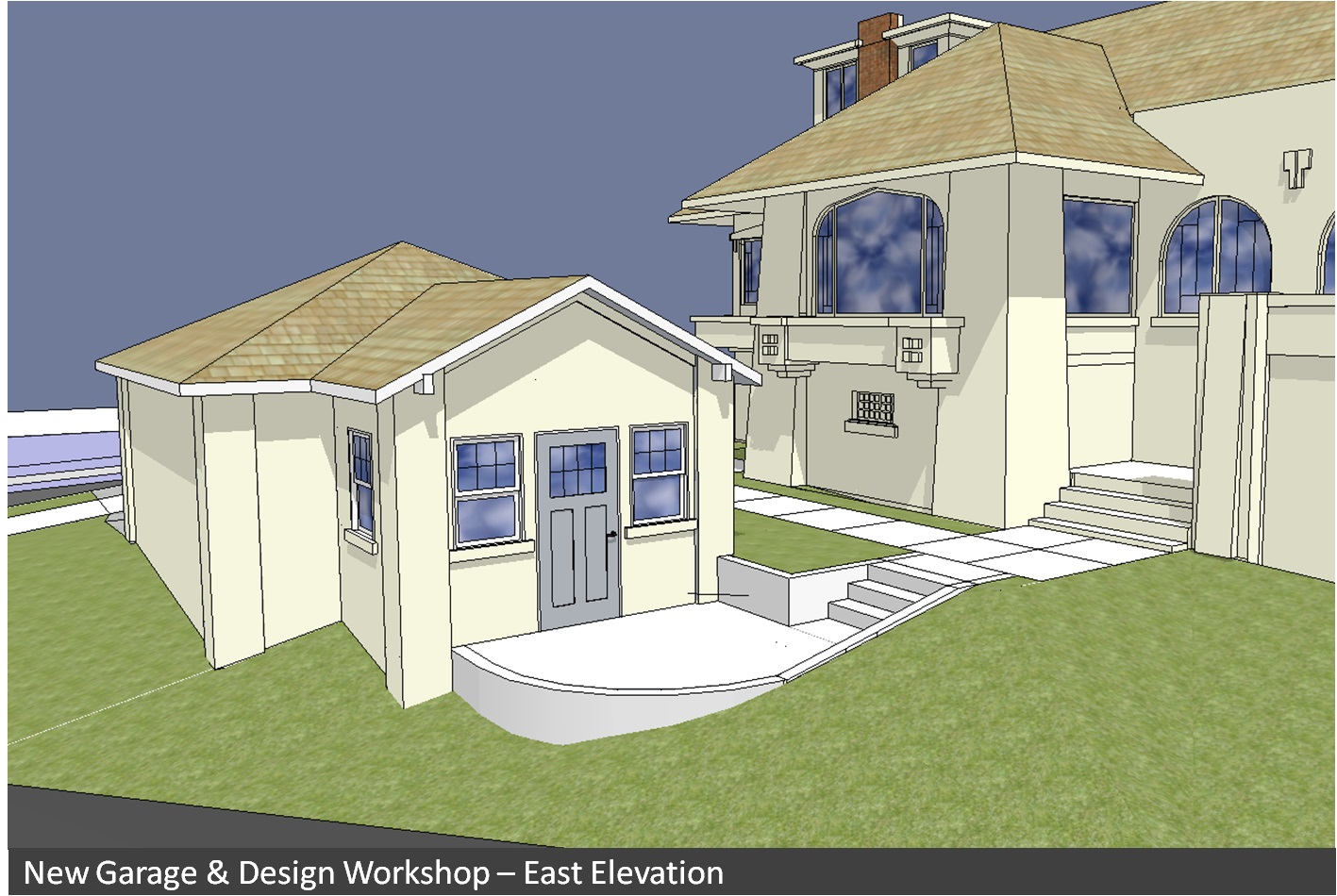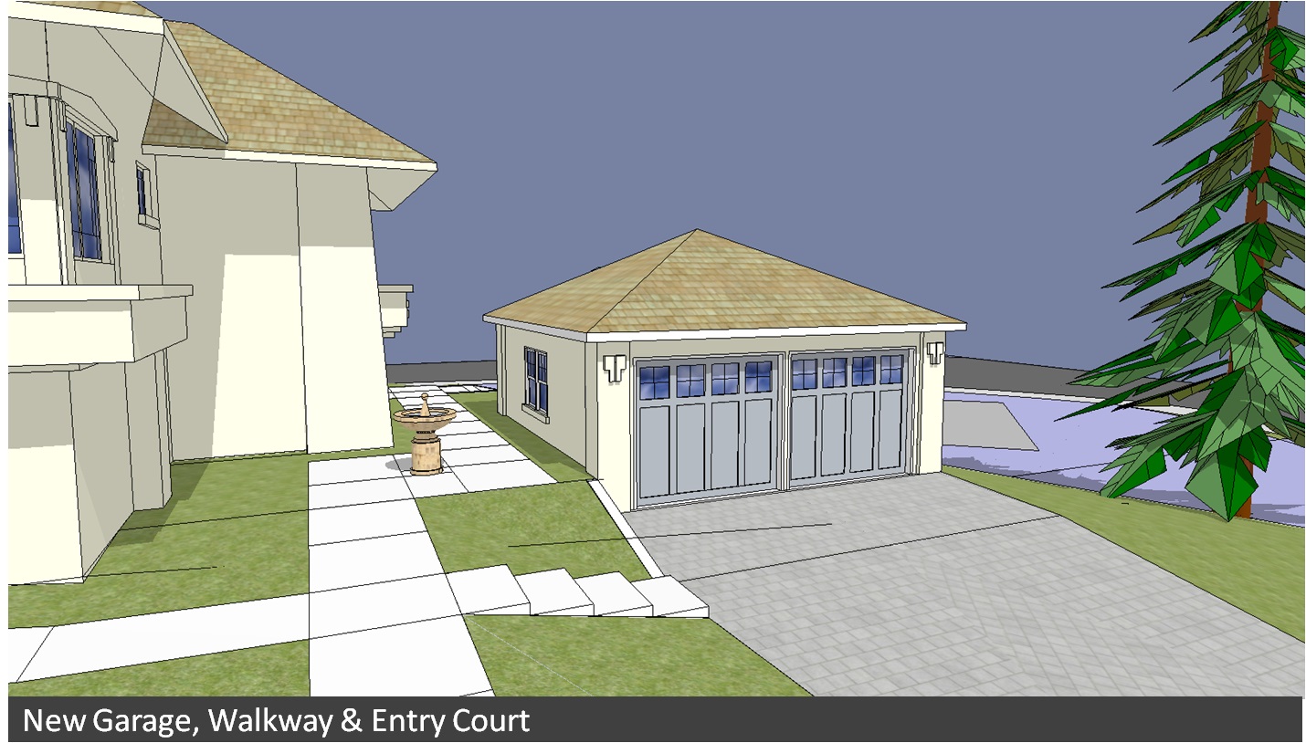 This project provided a challenging opportunity to design the new 2-car detached garage and integrated design workshop, reflecting the style and detailing of the existing house and complying with Planning front and side yard setback requirements. The best solution was to locate the garage parallel to the existing house in the front yard, meeting setback requirements, but at a lower elevation for direct access from the street and enabling the panoramic views from the living level of the house to be retained over the garage hip roof. This siting also respected the proximity to the adjoining mature redwood. The positioning of the garage included creation of a new walkway and series of entry courts and new landscaping that visually identify and lead to the main entry of the house. The design workshop included a separate entry and outdoor space with light and views. And the design detailing reflects the style of the original house including use of hip roof and overhanging eaves, scale of fenestration, and stucco corner piers and ornamentation.