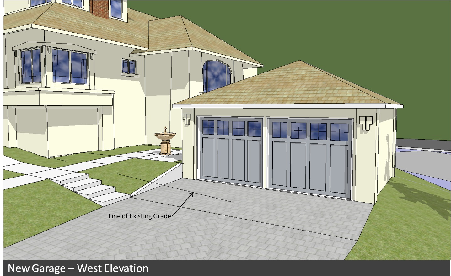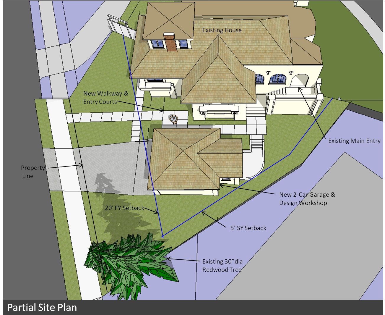The existing house is a large two story craftsman with steep hip roofs, generous overhanging eaves and “secession style” detailing. The property is large, non-rectangular, with 10% slope down to the street frontage. The house is sited in the center of the property facing straight south, which is angled away from the street frontage. The original design did not include a garage and the main entry to the house was hidden away from the street frontage by the projecting living room bay. And the property also includes a mature redwood at the south property line adjoining the desired location for the new garage.